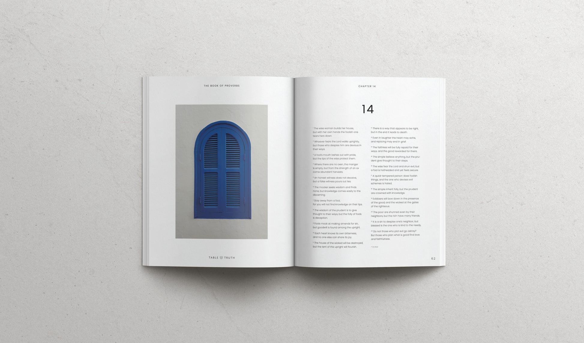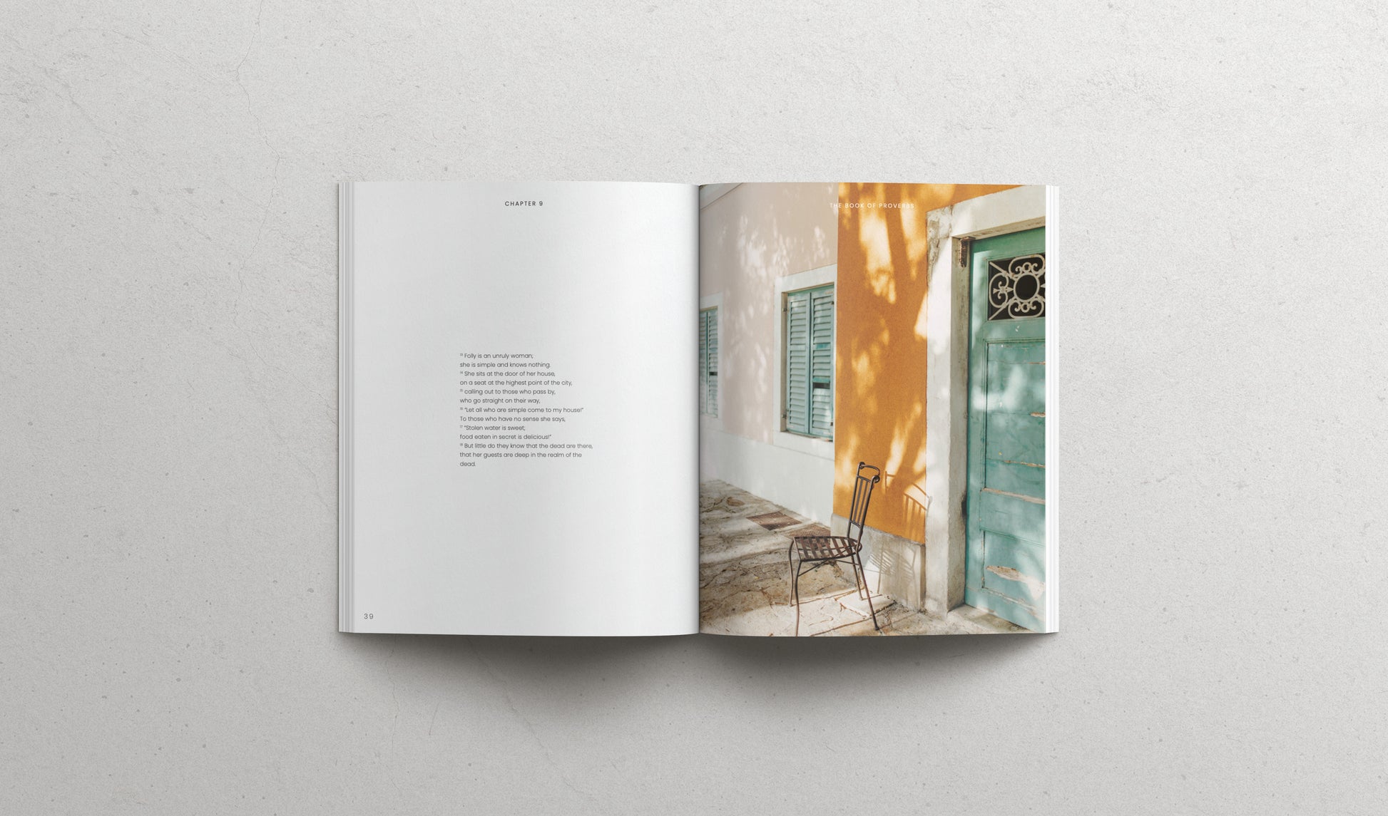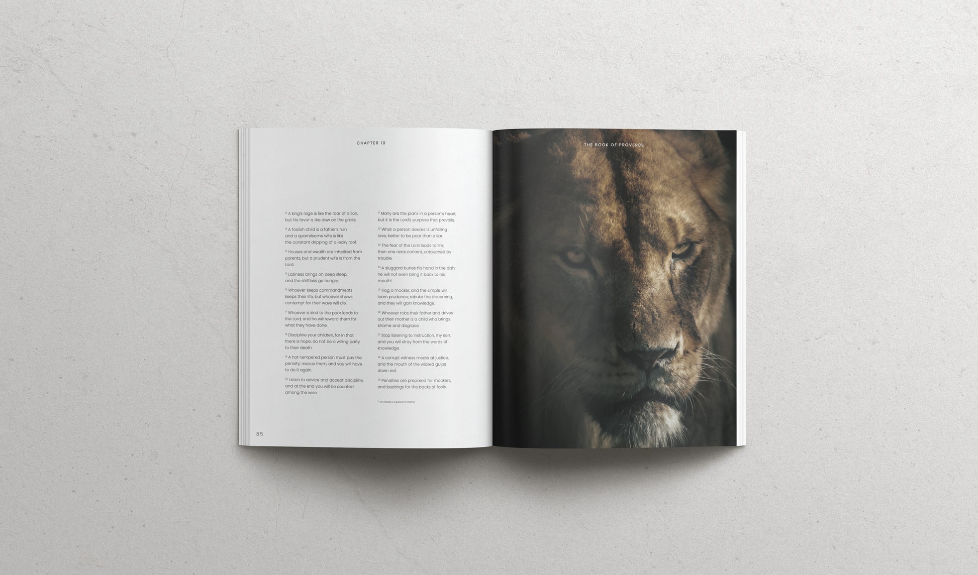 The Book of PROVERBS was taken as is, and carefully redesigned with thoughtful consideration into 160 pages of a beautiful, visual work of art. The pages are filled with breathtaking visual images that enhance the profound and timeless Book of Proverbs.